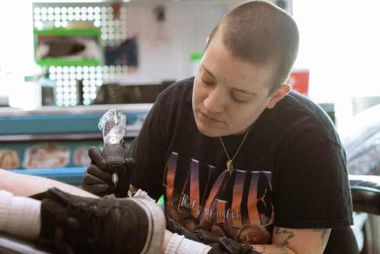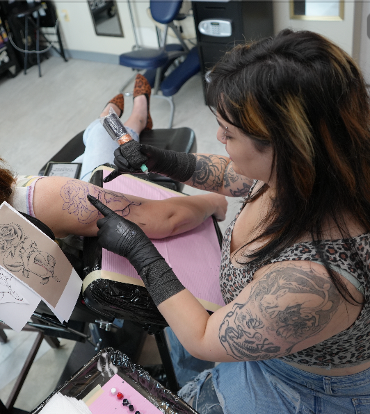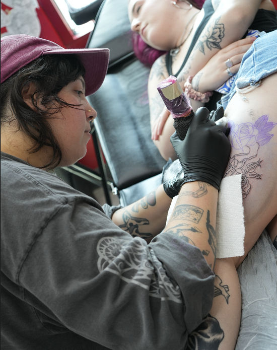 3YRS EXPERIENCE-Tina has been crushing it daily at 5th layer now for 4 years. They were trained by our shop owners Dizzy and Megan. Now they have been tattooing 3 years and is a powerhouse when it comes to traditional style tattoos! If you're looking for that and a bundle of creativity, Tina is the artist for you! They have a deep of love for any American/European Traditional tattooing style that features queer themes or vintage reference! Which can be done in color, Black n Grey, or a mix of both. On top of their large store of original flash (believe three books and counting), they can create custom pieces with any references or ideas you've got floating around in your head. Give them a challenge and be marveled at the results!