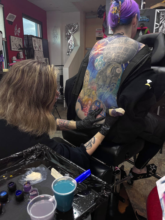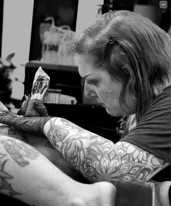 10YRS EXPERIENCE- Dizzy's excellent reputation usually proceeds the introduction, but you haven't heard about her experience in wresting alligators yet...then you're welcome. Owner and founder, Dizzy has been tattooing for 11 years, and if you haven't been tattooed by her what are you doing on this newsletter list.....just kidding! But really she's a powerhouse of just about any style you give her and it's amazing to watch her work! Dizzy specializes in Nerdy Neo traditional tattoos, bold designs not designed for the weak of heart or spirit! Get past her stoic side and you'll see a goofball who just wants to talk about dinosaurs. You got a reptile? Dizzy can and will wrestle 'em, boop 'em, n tattoo 'em. Get in her chair already and bring her a snack-she is hungry!